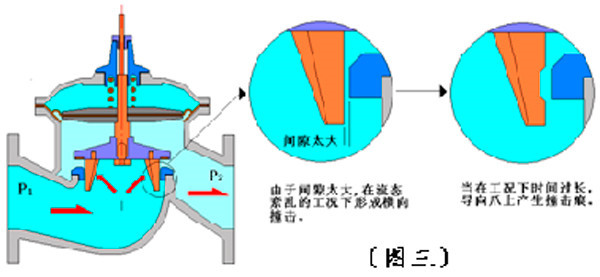 4.2.2導(dǎo)向爪與閥座的間隙太大(總間隙1mm)。因此,當(dāng)紊流產(chǎn)生時(shí)形成導(dǎo)向爪與閥座之間的相互撞擊。由于導(dǎo)向爪為銅材質(zhì)、閥座為不銹鋼材質(zhì),工作時(shí)間一長(zhǎng),在導(dǎo)向爪上形成撞擊痕跡。如圖三所示