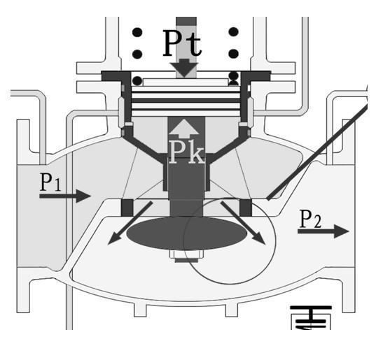 當(dāng)P1上升時(shí),減壓閥的P2+ΔP2首先表現(xiàn)為上升,其值通過反饋系統(tǒng)出口管傳到控制閥,使Pt′+ΔPt′,ΔPt′與Pk′的力達(dá)到新的平衡,控制閥h減??;相應(yīng)ΔPk′壓力增大,經(jīng)壓力導(dǎo)管,使主閥的Pk+ΔPk,Pt=Pk+ΔPk壓力達(dá)到新的平衡,主閥h減小、ΔP2值恢復(fù)為原P2值。當(dāng)進(jìn)口壓力P1下降時(shí),主閥與控制閥的工況則與上述的工況相反。