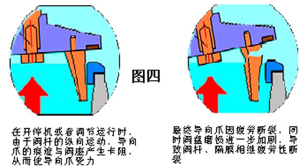 4.2.3終,因機(jī)組開停機(jī)或流量變化時(shí),導(dǎo)向爪上形成痕跡卡在閥座上,在縱向受力的工況下,導(dǎo)致導(dǎo)向爪、閥桿的彎曲或斷裂。如圖四所示。#5、#4機(jī)減壓閥解體檢查看,閥座不銹鋼圈螺栓存在松動(dòng)、脫落隱患,隔膜碟鎖固螺栓也無(wú)安全鎖定措施等,致使減壓閥在使用過程中存在一定的安全風(fēng)險(xiǎn)。