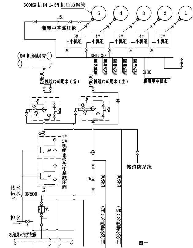 3.1機組技術(shù)供水系統(tǒng)(如下圖一所示)設(shè)計采用技術(shù)供水水源機組(小機)集中供水和單機單元自流減壓供水的混合供水方式,其中一路是采用5臺水源機組發(fā)電減壓后的尾水集中匯流至匯流母管,從匯流母管上分別引出5路供水作為600MW機組的技術(shù)供水主用水源,另一路采用600MW機組鋼管取水通過自流減壓后作為600MW機組的技術(shù)供水備用水源。